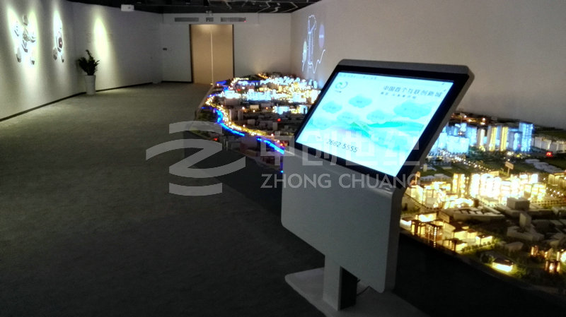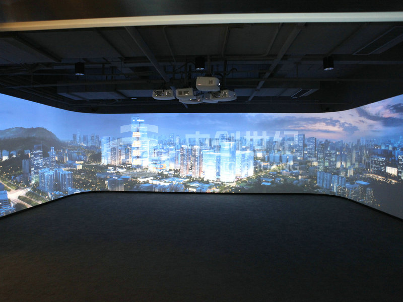 整個(gè)系統(tǒng)涉及擴(kuò)聲音響、投影顯示、液晶拼接、高清信號(hào)傳輸以及集中控制等系統(tǒng)組成。其中影院區(qū)采用3臺(tái)高清投影機(jī)融合滿足143度弧型顯示;沙盤(pán)區(qū)采用1臺(tái)高清投影機(jī)與1臺(tái)360度高清投影機(jī)拼接滿足L型幕的顯示;體驗(yàn)區(qū)采用6臺(tái)高清投影機(jī)整合滿足三面環(huán)幕顯示;品牌接待區(qū)采用3*3 46寸LED超窄邊液晶拼接大屏。