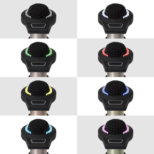 ES945O/FM5 全指向性電容式界面話筒配備了5針 XLRM 型輸出連接器和一個電容感應式輕觸開關,可增強對會議室裝置的控制。不僅可以將開關設置為在控制話筒靜音和收音之間的切換,還可以通過話筒的接點閉合來觸發外部設備,例如攝像頭或房間的照明系統。采用不顯眼設計,可以安裝在桌面或控制面板上,以提供最佳的隱藏性,提供清晰而通透的收音,非常適合會議、錄音、監聽和其他要求苛刻的收音應用,而話筒頂部設有可見度高的雙態式 RGB LED 燈環(7種可選顏色 + 關燈),能顯示開啟/靜音狀態。