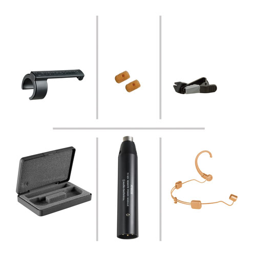 AT8539 供電模組及腰帶夾;AT8440 導線固定夾;AT8464 雙耳式話筒掛架;兩個AT8163 防風海棉;防汗水環;便攜保護袋